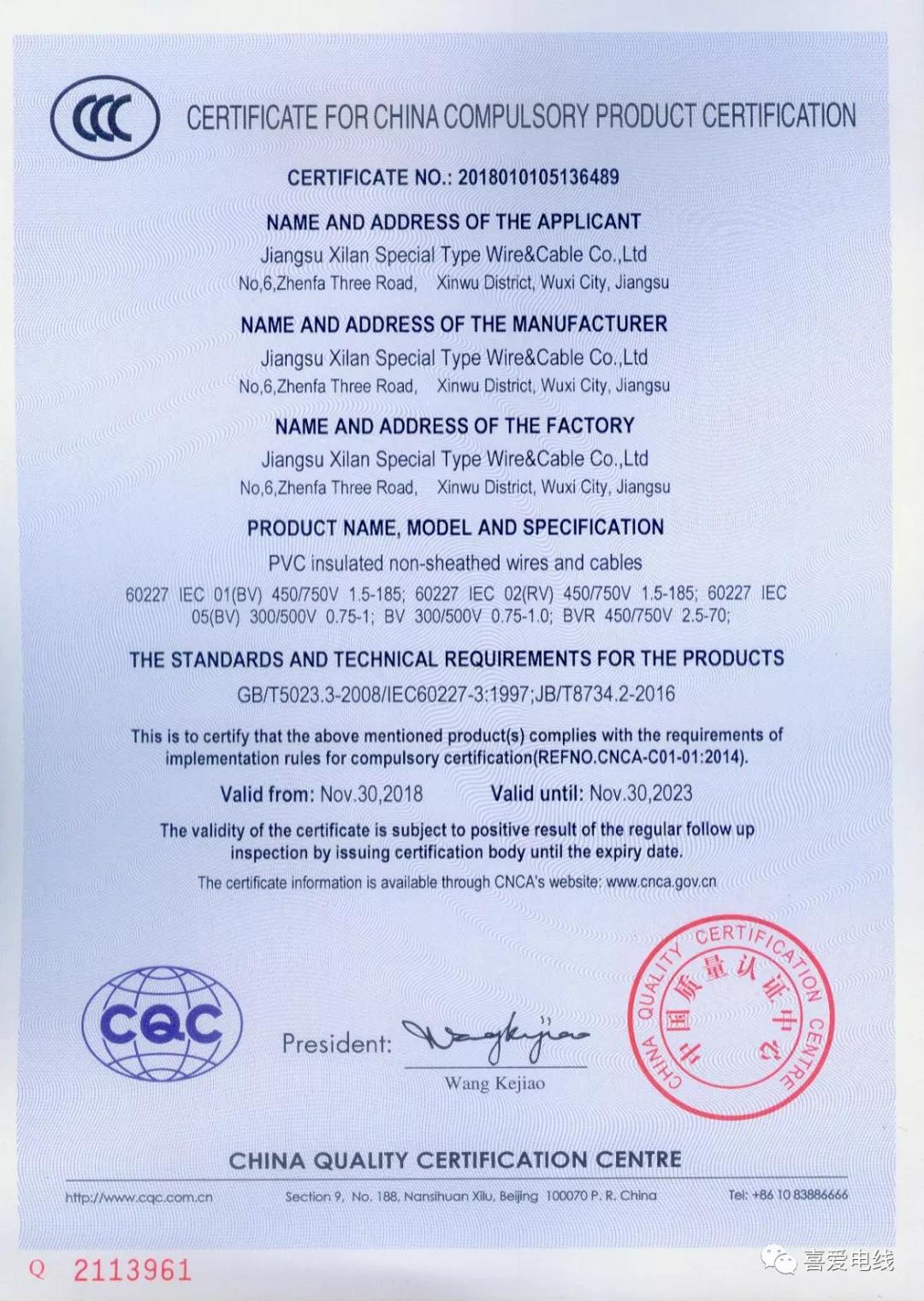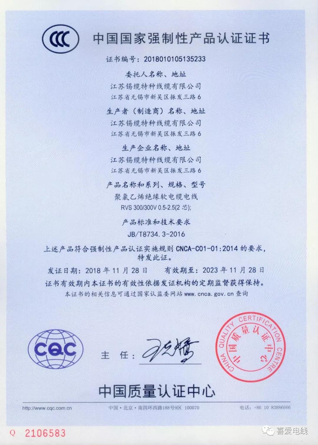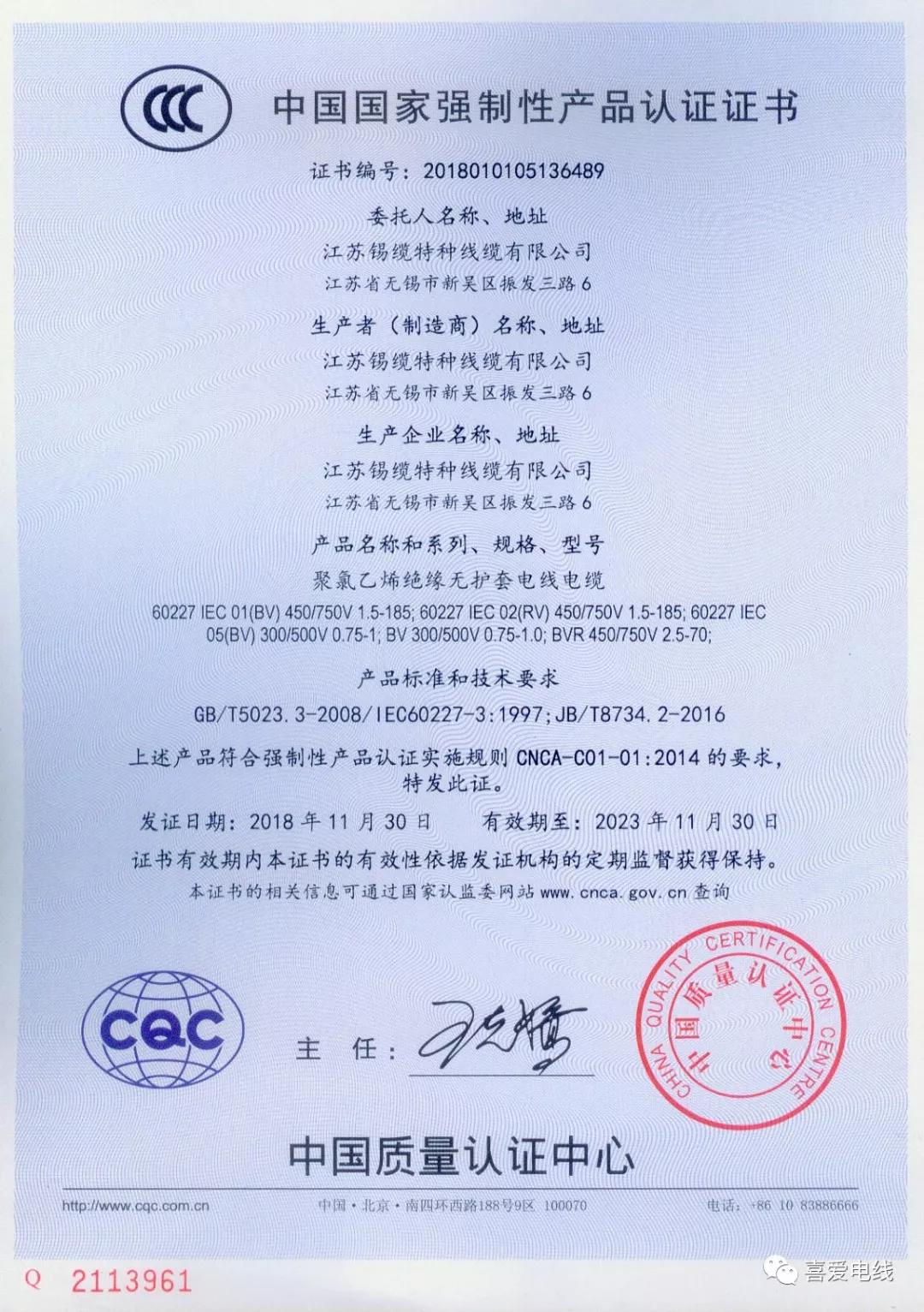 聚氯乙烯絕緣無護(hù)套電線電纜認(rèn)證證書: