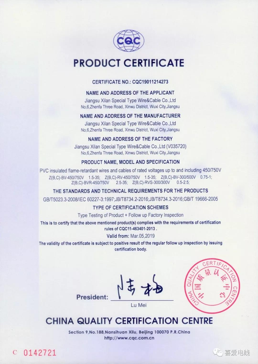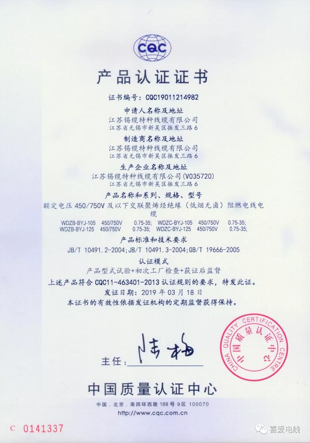 低煙無鹵電纜電線產(chǎn)品認證證書: